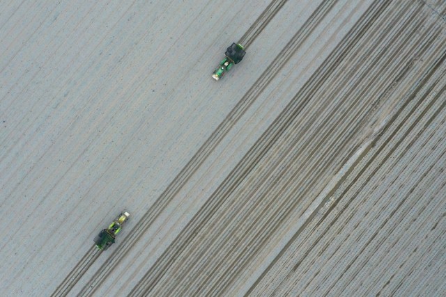 正在新疆巴音郭楞蒙古自治州博湖县本布图镇,农户操做移栽机正在农田里移栽辣椒苗(4月28日摄,无人机照片)。记者丁磊 摄?。