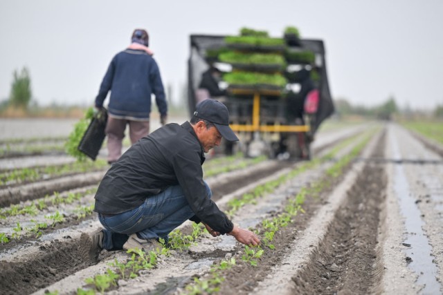 正在新疆巴音郭楞蒙古自治州焉耆回族自治县四十里城子镇,农户查抄栽苗结果(4月26日摄)。记者丁磊 摄。